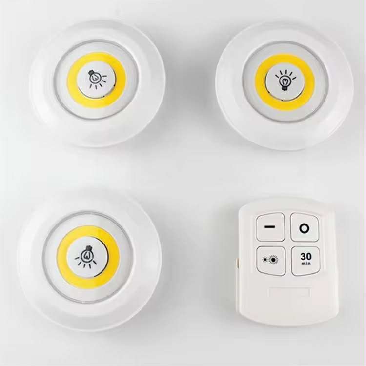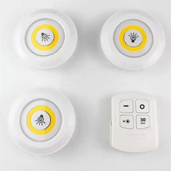 Set of 3 wireless LED puck lights with remote control. Features dimming, 30-minute timer, and easy stick-on installation. Ideal for closets, cabinets, and more. Battery operated.
